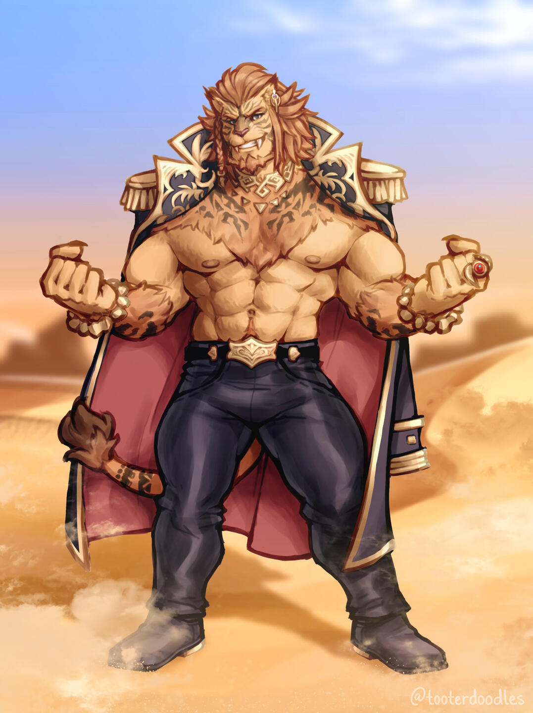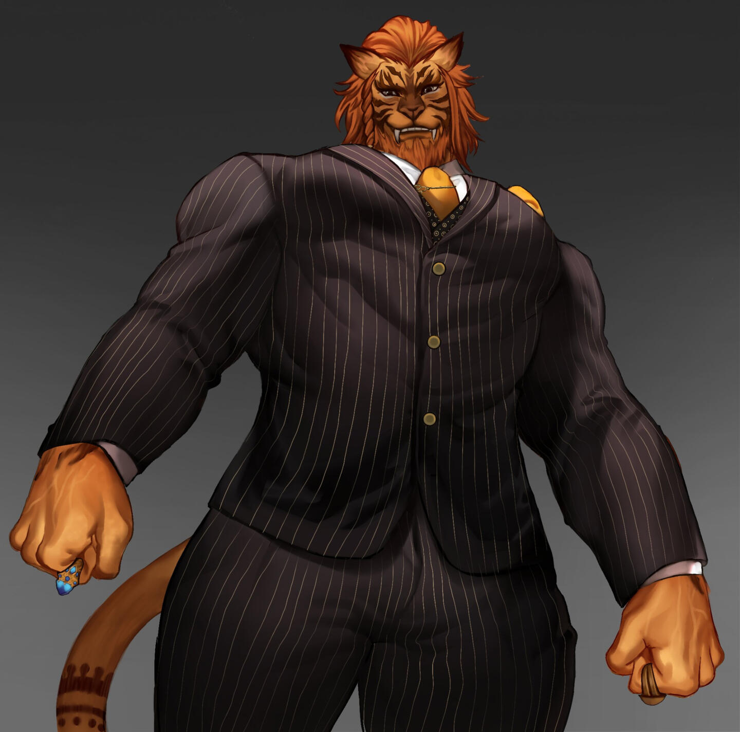 Hair: Long, neatly kept mane with a gold pendant adorning his braid. Amber colored hair and fur with black stripes.